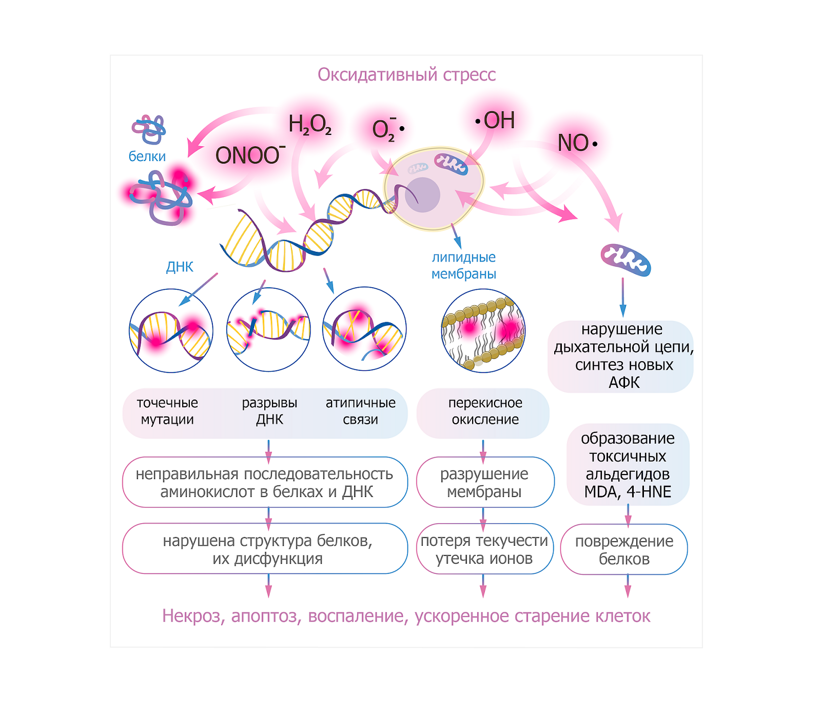 Нуклеиновые кислоты: мутации, нарушения репарации и клеточная нестабильность. ДНК и РНК — мишени, особенно уязвимые для воздействия радикалов. При окислении азотистых оснований образуется группа соединений, которые объединяют под общим названием «продукты окислительного повреждения нуклеиновых кислот», к числу которых относятся 8-гидроксидезоксигуанозин (8-OHdG), 8-гидроксигуанозин (8-OHG) и 8-гидроксигуанин (8-OHGua). Последствия повреждения - ошибки репликации и транскрипции, активация систем репарации, остановка клеточного цикла. Накопление подобных ошибок приводит к повышению риска мутаций и канцерогенезу. Клетки с высоким темпом деления (эпителий, клетки иммунной системы) реагируют особенно остро.